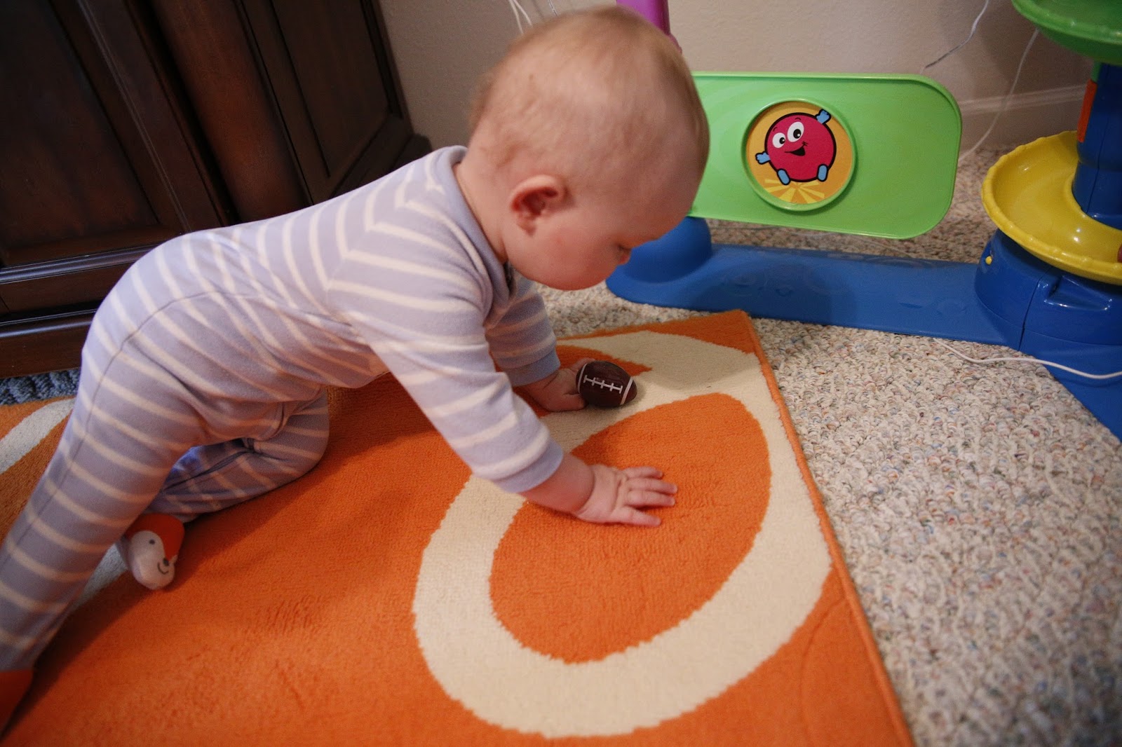 - Development: You crawl all of the place, typically trying to get to the dog's food and water dishes. You've figured out how to climb the stairs now too.